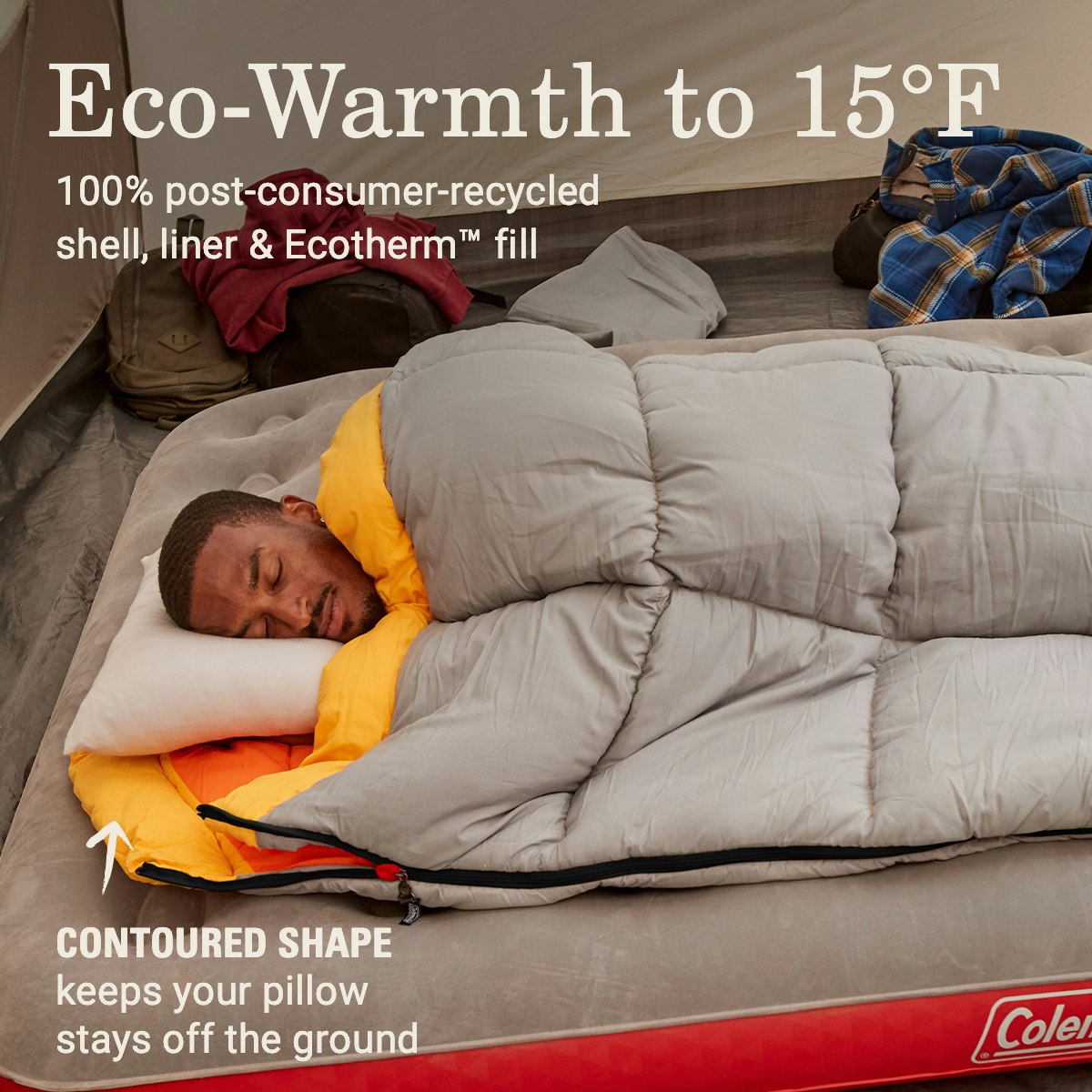 Outdoor enthusiasts rely on Coleman® sleeping bags for the care that goes into every detail. And like you, we also care about the environment. That’s why our Arch Bayâ„¢ cold-weather sleeping bags are made with 100% post-consumer-recycled polyester in the shell, liner, and Ecothermâ„¢ fill. Insulated to keep you warm in temps as low as 15°F and it’s sized for campers up to 6′ 5″ tall. The contoured design provides extra space for your head and pillow. Our ZipPlow zipper offers easy, snag-free use and the Thermolockâ„¢ draft tube keeps cold air out. Soft Comfort Cuffâ„¢ trim frames the face. And when it’s time to head home, Roll Controlâ„¢ holds the bag straight, and our Quick Cordâ„¢ secures without tying. 84†x 39†size. Machine washable. 5-year warranty.