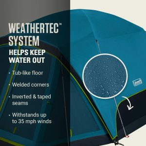 - BLOCKS WIND AND RAIN: WeatherTecâ„¢ system’s tub-like floor, welded corners, waterproof 3,000mm waterhead fabric, and inverted seams and taped seams on rainfly and tent body help keep water from getting in; strong frame has been tested to withstand up to 35 mph winds