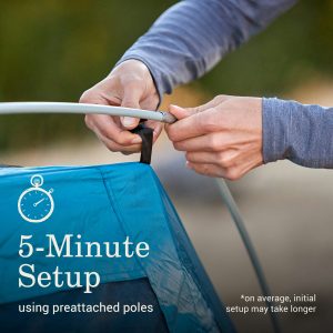 - QUICK SETUP: Sets up in 5 minutes using preattached poles; front left corner on tent and rainfly and brow pole sleeve are color coded red to help aid in fly orientation and setup