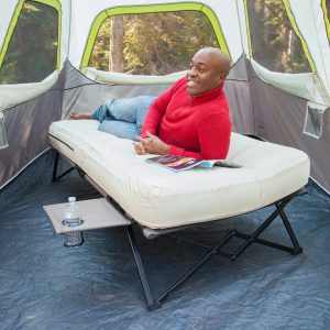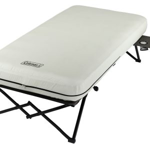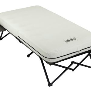 Wherever adventure leads, enjoy the elevated comfort of the Coleman® Camping Cot with Side Tables, Air Mattress & Battery Pump (4 D-cell batteries sold separately). The air bed stays inflated all night thanks to the leak-proof AirTight® system, and its ComfortStrong™ coil construction offers better support. For easy access during the night, place a flashlight or water bottle on the pull-out side tables complete with cup holders.