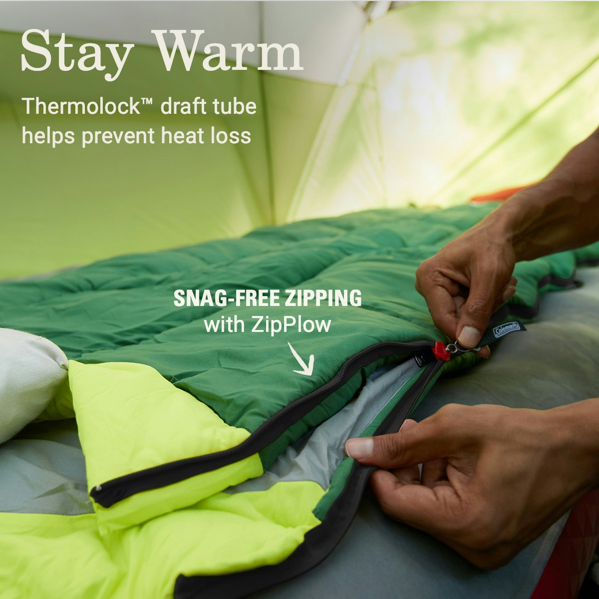 Outdoor enthusiasts rely on Coleman® sleeping bags for the care that goes into every detail. And like you, we also care about the environment. That’s why our Arch Bay™ cold-weather sleeping bags are made with 100% post-consumer-recycled polyester in the shell, liner, and Ecotherm™ fill. Insulated to keep you warm in temps as low as 30° F this bag is also loaded with premium features. The contoured design provides extra space to keep your head and pillow off the ground. Our ZipPlow zipper offers easy, snag-free use and the Thermolock™ draft tube keeps cold air out. Soft Comfort Cuff™ trim frames the face for warmth. And when it’s time to head home, Roll Control™ holds the bag straight, and our Quick Cord™ secures without tying. 81†x 33†size. Machine washable. 5-year limited warranty.