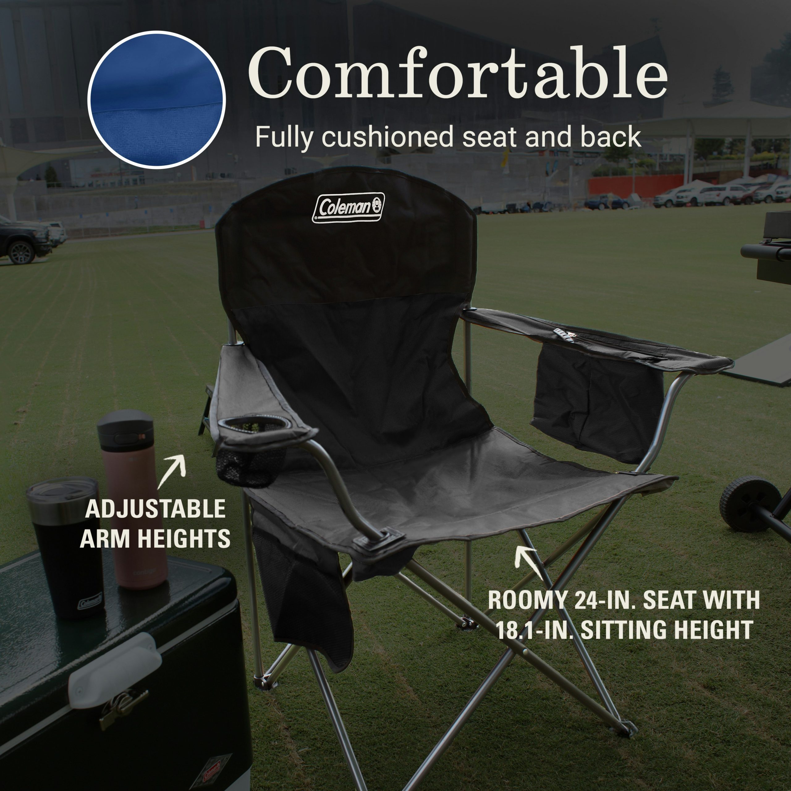 Always have a cold drink within easy reach at the campsite, tailgate, or kids’ ball game thanks to the cooler built into the armrest of the Camping Chair with Built-In 4-Can Cooler. The fully cushioned seat and back mean you’ll enjoy hours of relaxing comfort.
