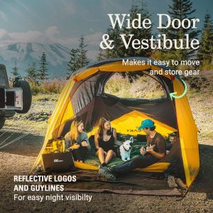 - WIDE DOOR AND VESTIBULE: Makes it easier to move and store backpacks, sleeping bags, and other gear
