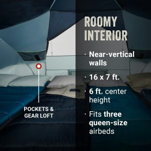 - Wide door design makes it easy to fit airbeds, gear, and move in and out of tent; large door awnings provide more weather protection and better airflow