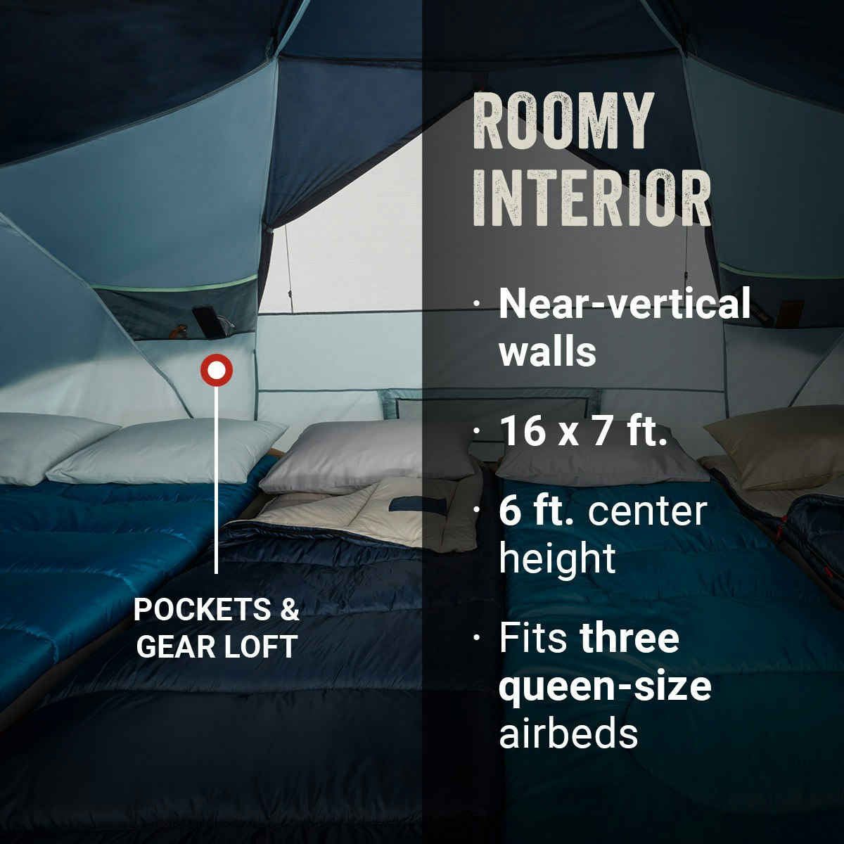 Sets up in under 5 minutes (based on average setup time with 2 people) so you spend less time pitching the tent and more time relaxing at the campsite. Go ahead and spread out, the Coleman® Skydome™ Camping Tent XL fits 3 queen-sized airbeds so you and your family can camp in comfort. The nearly vertical walls offer more headroom. Plus, a wide door design means you can move airbeds, sleeping bags, and other gear in and out with ease. Large door awnings provide more weather protection and better airflow. An E-port makes it easy to access an extension cord so you can bring electrical power inside your tent. Downpour in the forecast? This tent features the WeatherTec™ system with a tub-like floor and patented welded corners, while inverted seams and taped seams on rainfly and tent body help keep water out. Plus, the strong frame has been tested to withstand up to 35 mph winds. The extra-large size makes this tent a great choice for car camping with a large group. So gather around and make some memories outside. These Skydome™ tents are available in a range of sizes: 8-person, 10-person, and 12-person.