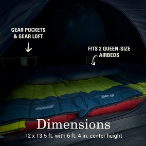 - DIMENSIONS: 12 x 13.5 ft. with 6 ft. 4 in. center height; fits 2 queen-size airbeds (3.7m x 4.1m x 1.9m)